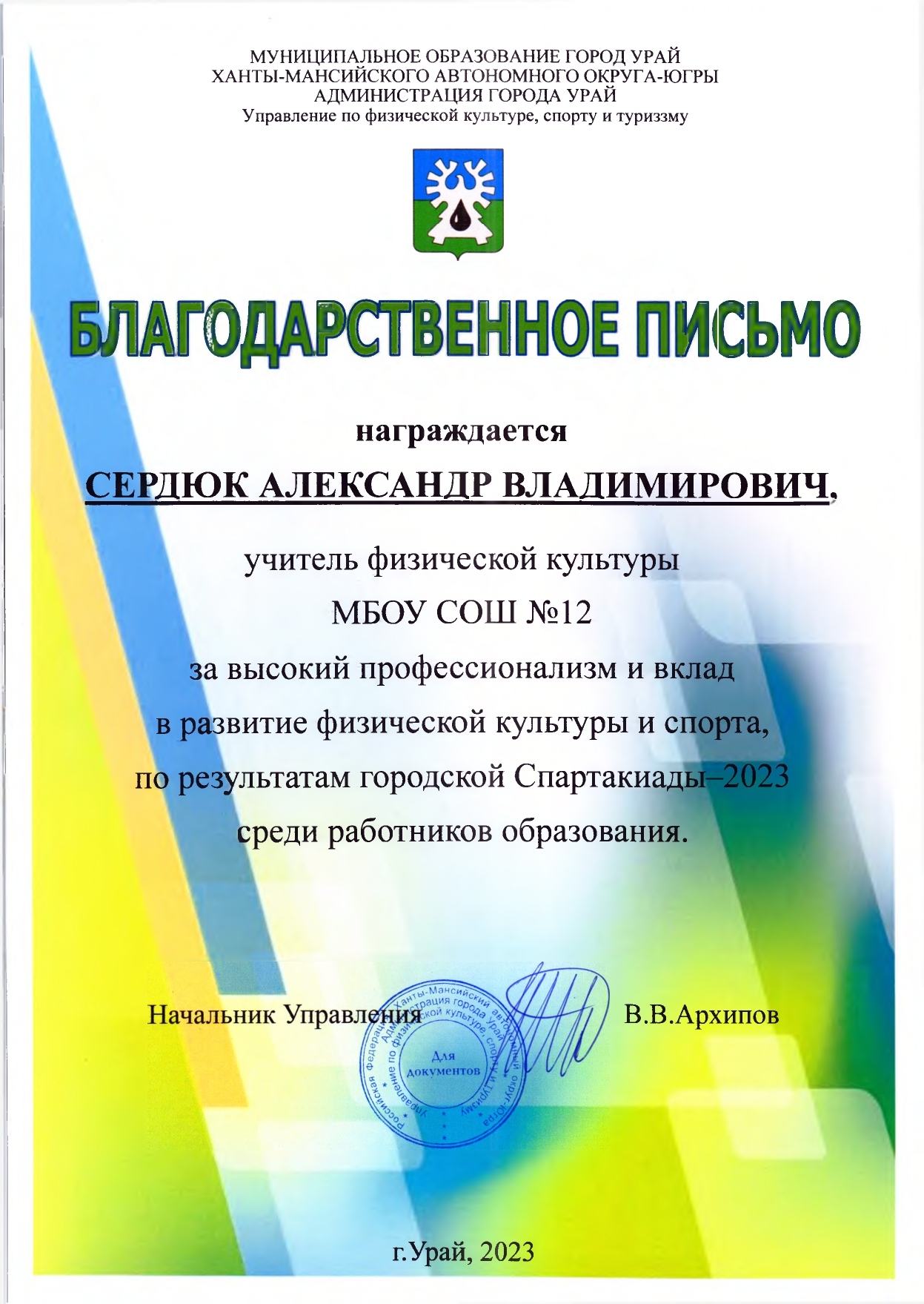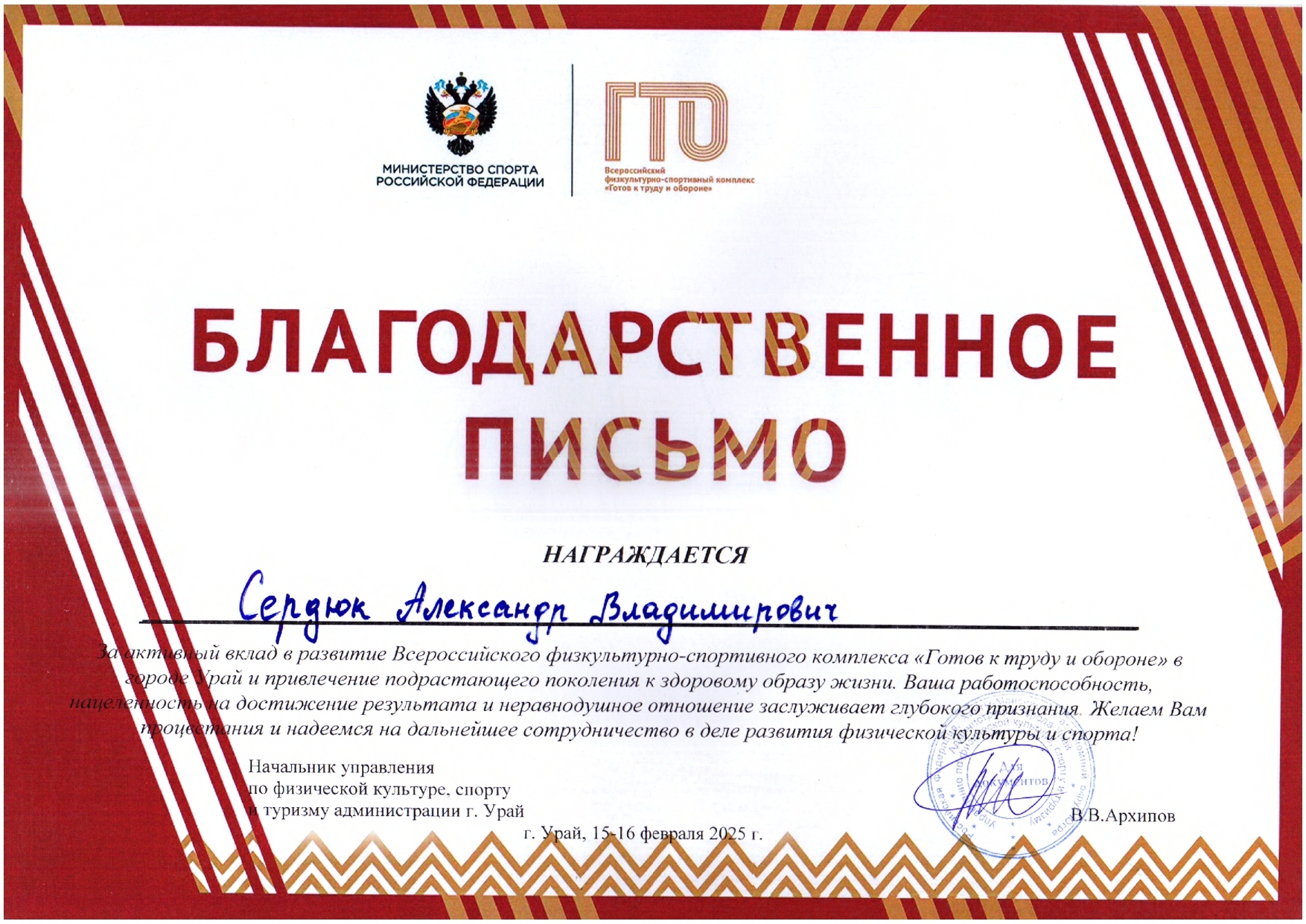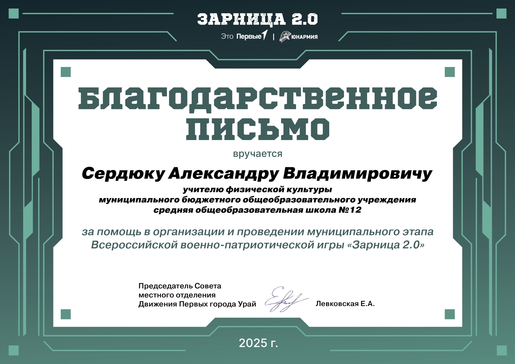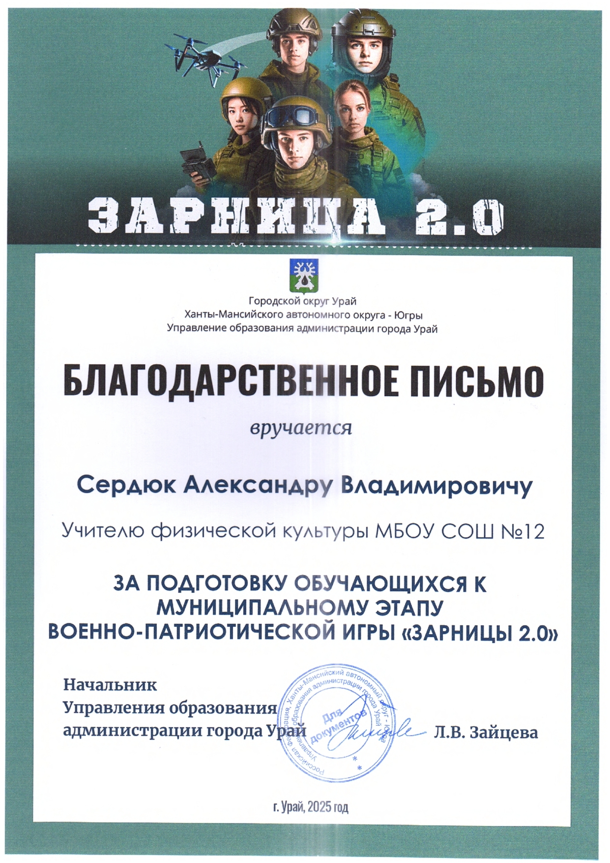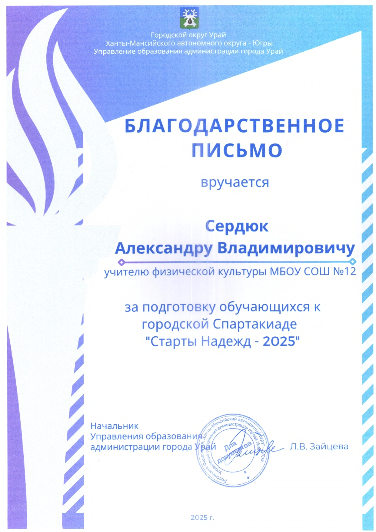 Отмечен Благодарственным письмом Управления образования администрации города Урай за подготовку обучающихся (1 место) к городской Спартакиаде "Старты Надежд - 2025";