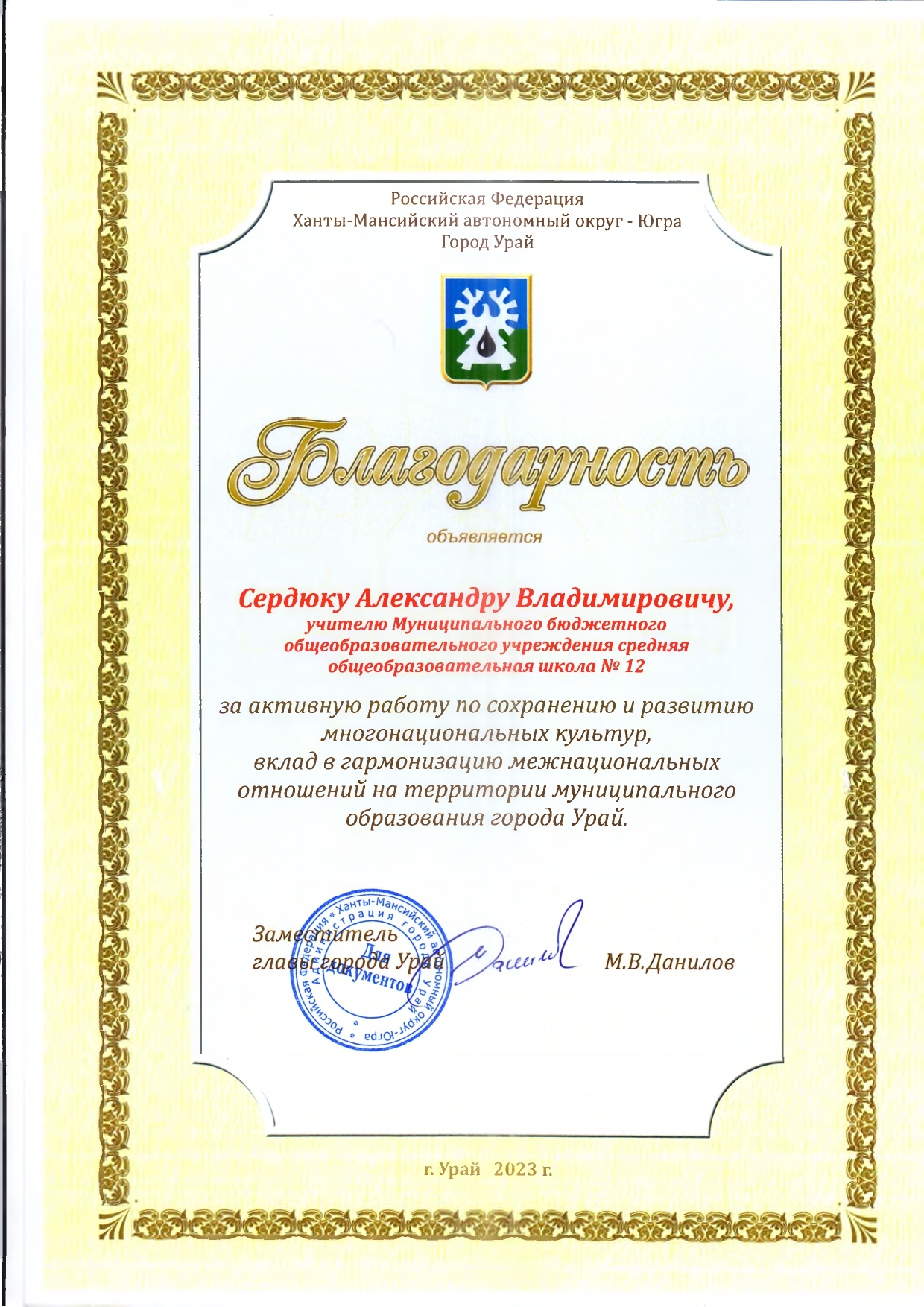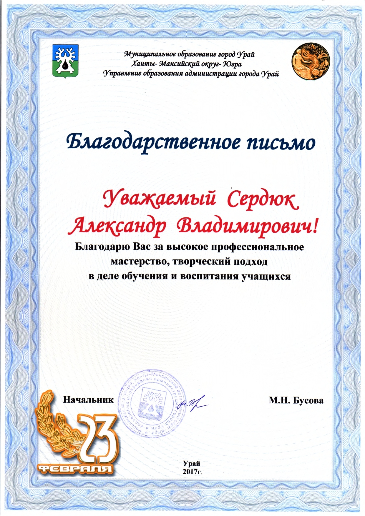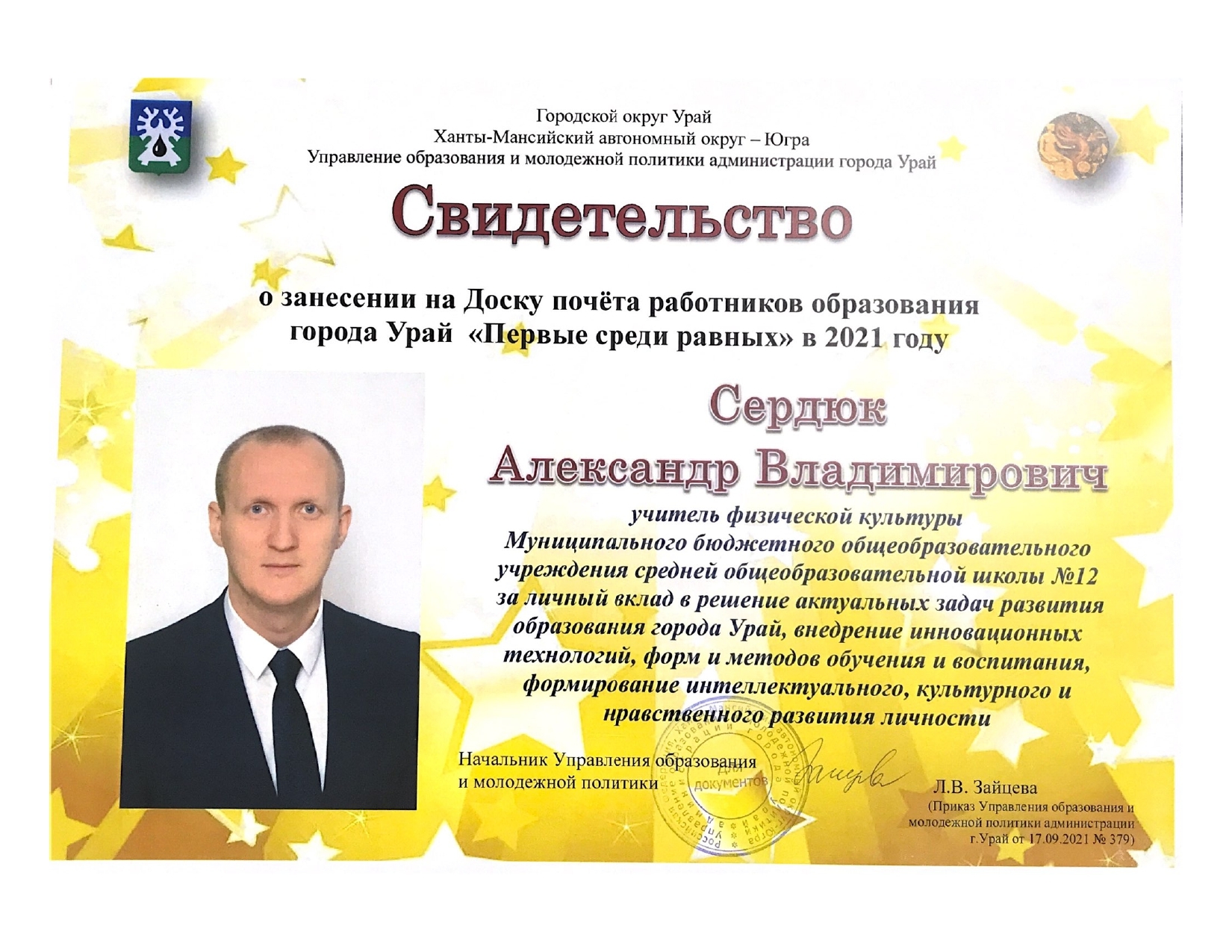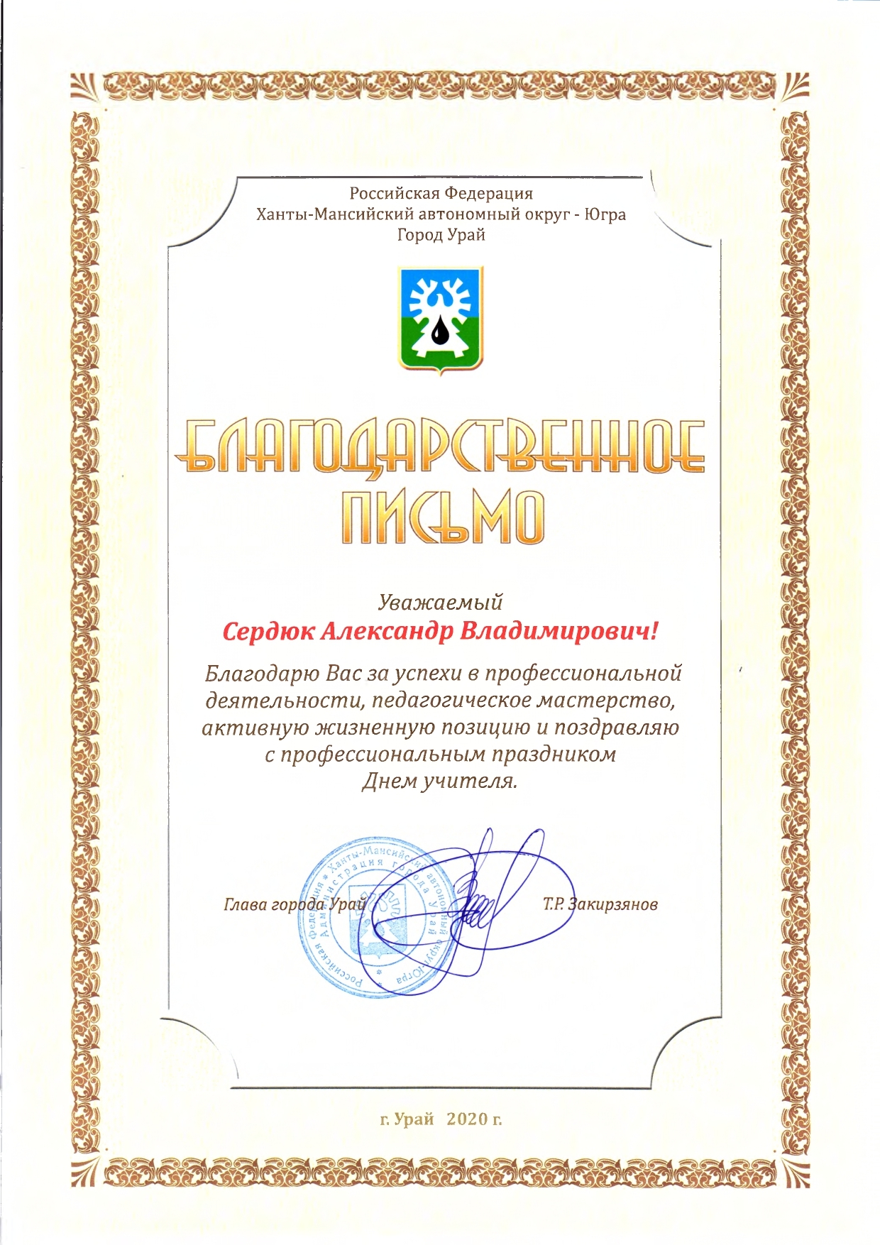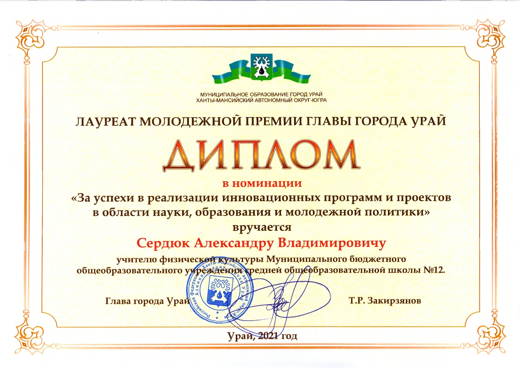 Отмечен Благодарственным письмом Управления образования администрации города Урай за подготовку обучающихся (1 место) к городской Спартакиаде "Старты Надежд - 2025";