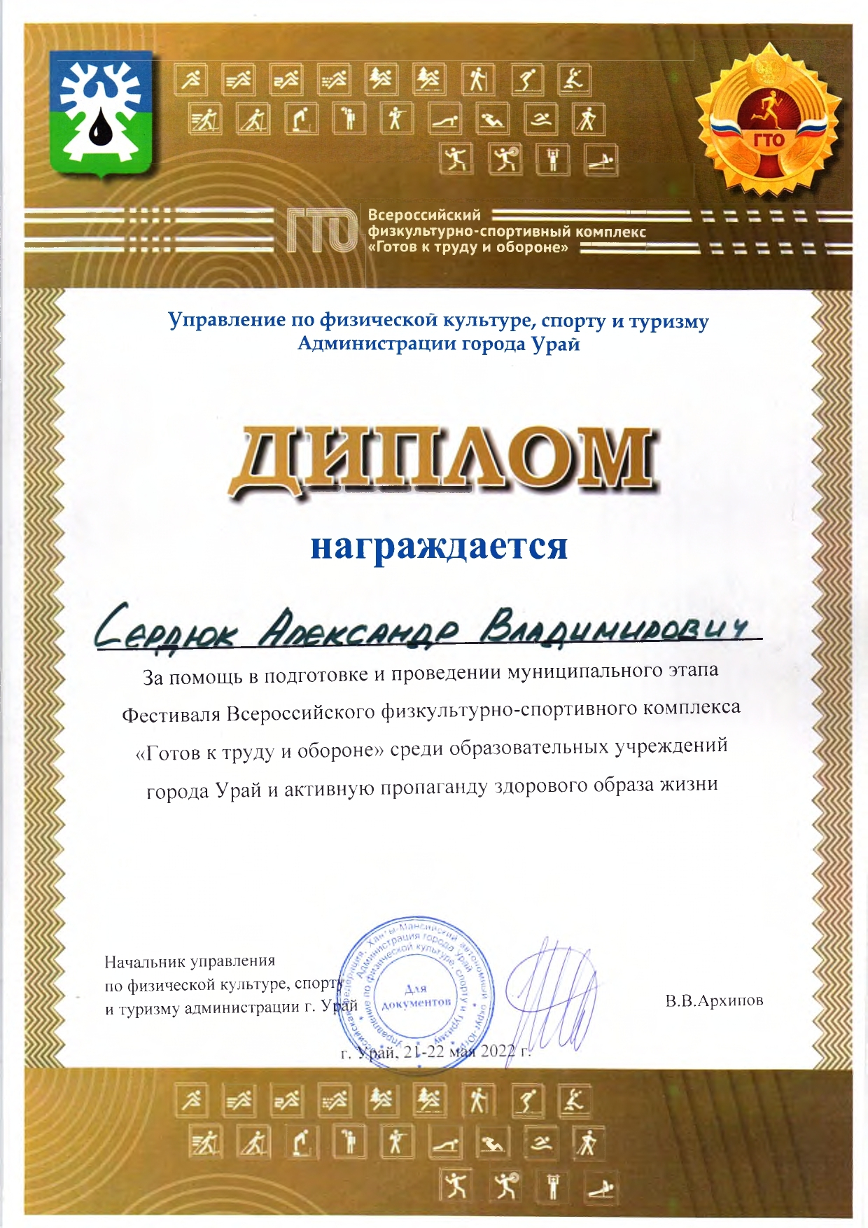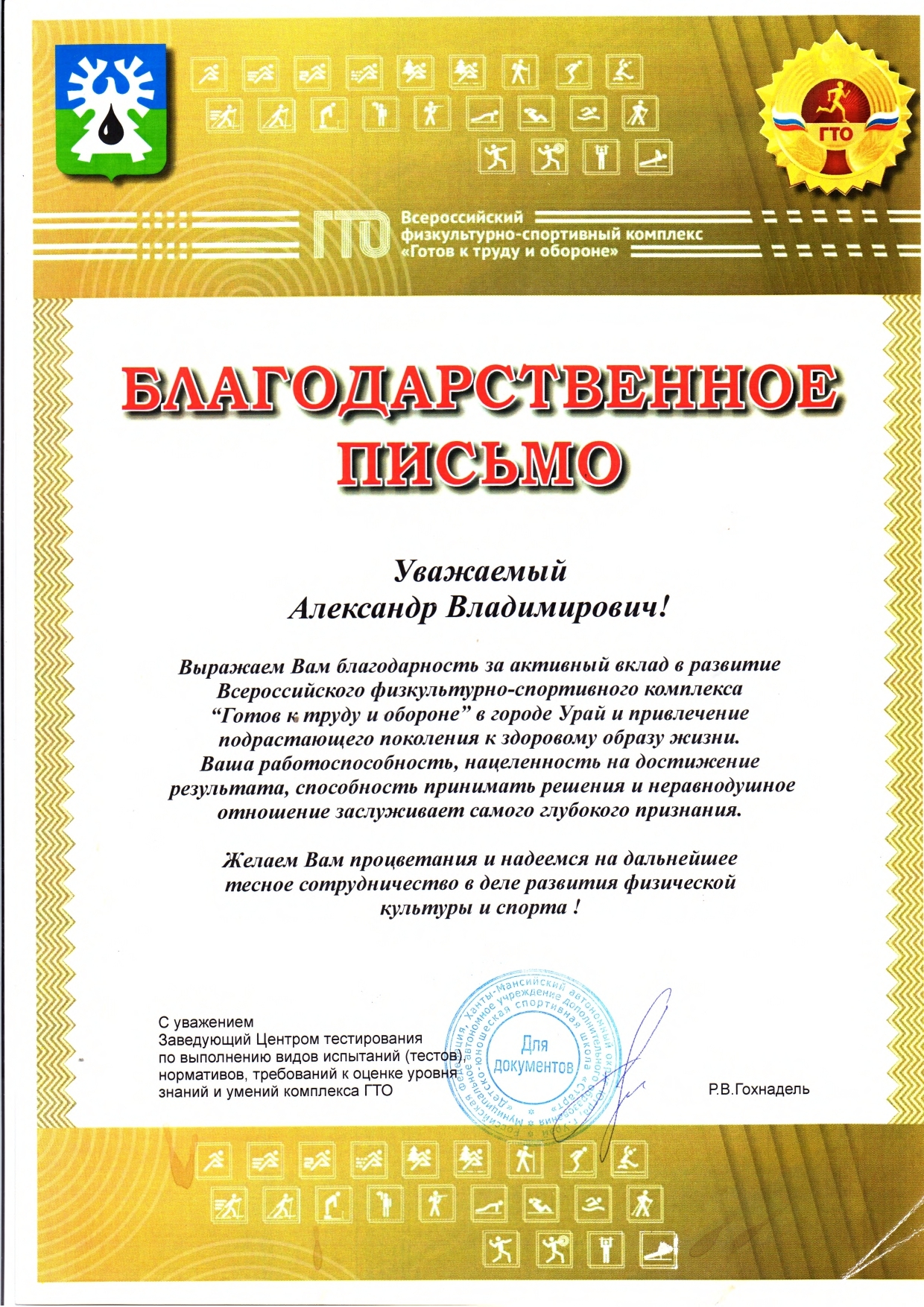 За активный вклад в развитие Всероссийского физкультурно-спортивного комплекса «Готов к труду и обороне» в городе Урай и привлечение порастающего поколения к здоровому образу жизни, за нацеленность на достижение результата отмечен Благодарственным письмом (2024г., 2025г.), Дипломом Управления по физической культуре, спорту и туризму администрации города Урай, воспитанники школы являются победителями и призерами данного фестиваля (2024г.);