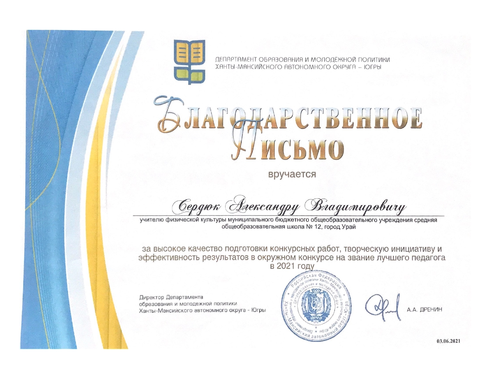 Отмечен Благодарственным письмом Департамента образования и молодежной политики Ханты-Мансийского автономного округа – Югры за высокое качество подготовки конкурсных работ, творческую инициативу и эффективность результатов в окружном конкурсе на звание лучшего педагога в 2021 году;