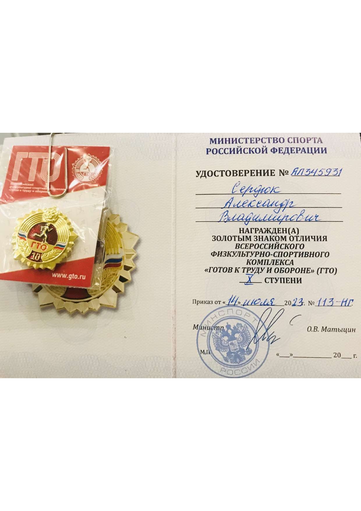 Обладатель Золотого знака отличия Всероссийского физкультурно-спортивного комплекса «Готов к труду и обороне» ГТО Х ступени (2023г.);