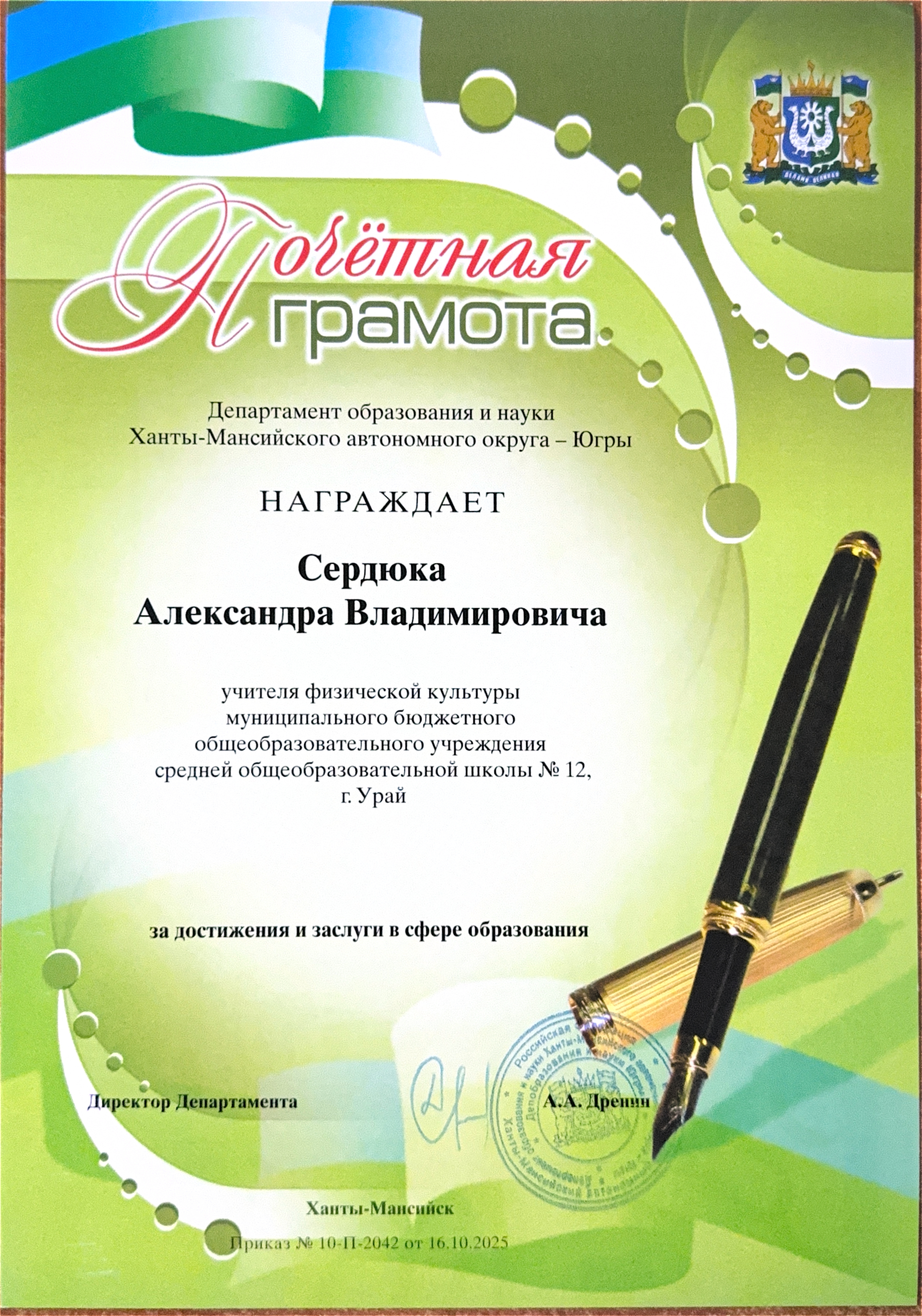 За достижения и заслуги в сфере образования отмечен Почётной грамотой Департамента образования и науки Ханты-Мансийского автономного округа (2025г.);