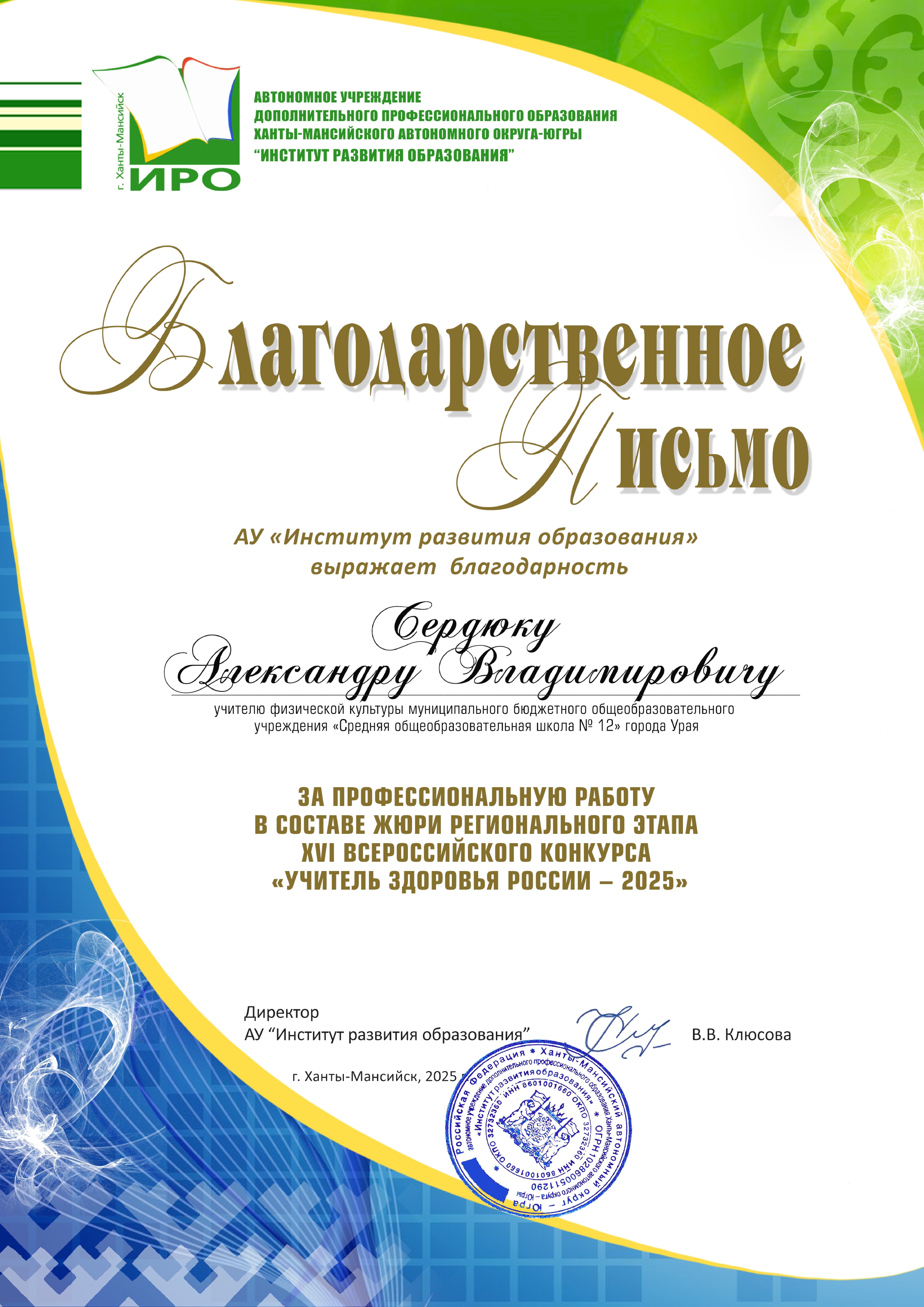 Отмечен Благодарственным письмом за профессиональную работу в составе жюри регионального этапа XVI Всероссийского конкурса "Учитель Здоровья России - 2025";