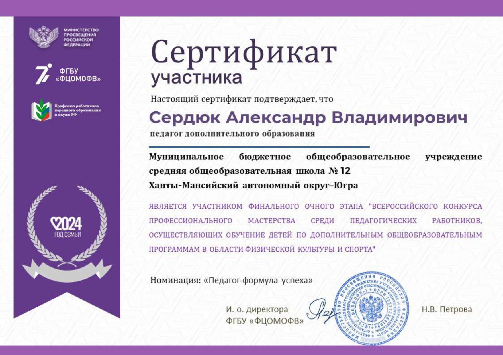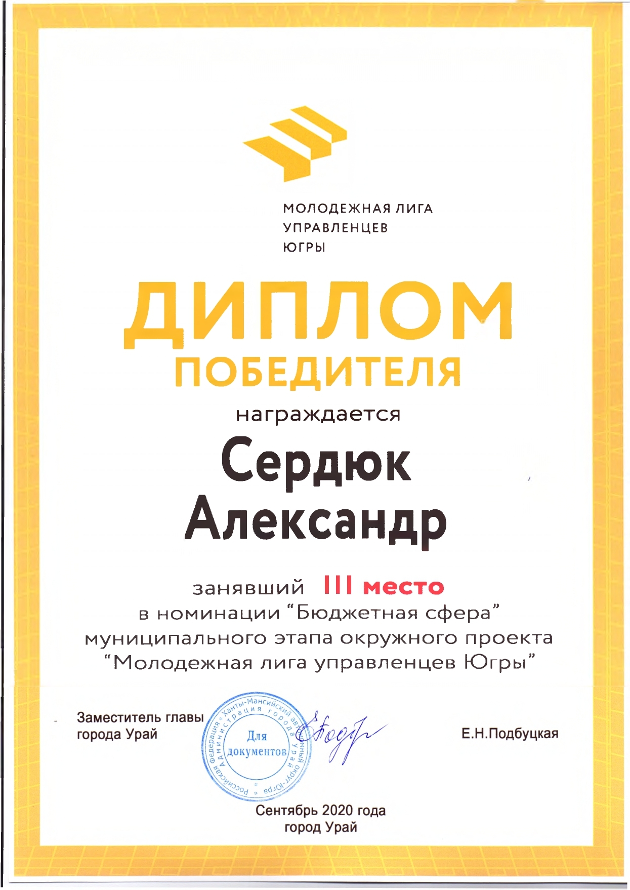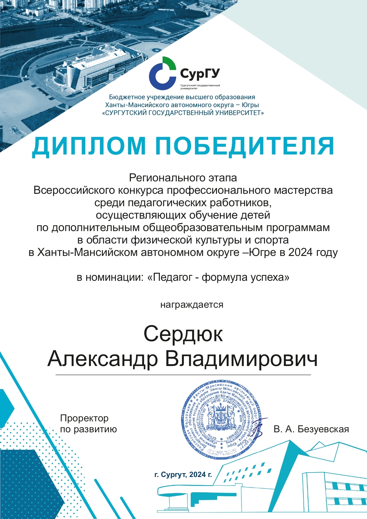 За совершенствование профессионального мастерства, оценки эффективности деятельности, по обновлению содержанию и технологии дополнительного образования физкультурно-спортивной направленности, методику и технологию обучения и воспитания обучающихся, достижения воспитанников, укрепление здоровья подрастающего поколения - Победитель регионального этапа Всероссийского конкурса профессионального мастерства среди педагогических работников, осуществляющих обучение детей по дополнительным общеобразовательным программам в области физической культуры и спорта в Ханты-Мансийском автономно округе – Югре в номинации «Педагог – формула успеха».