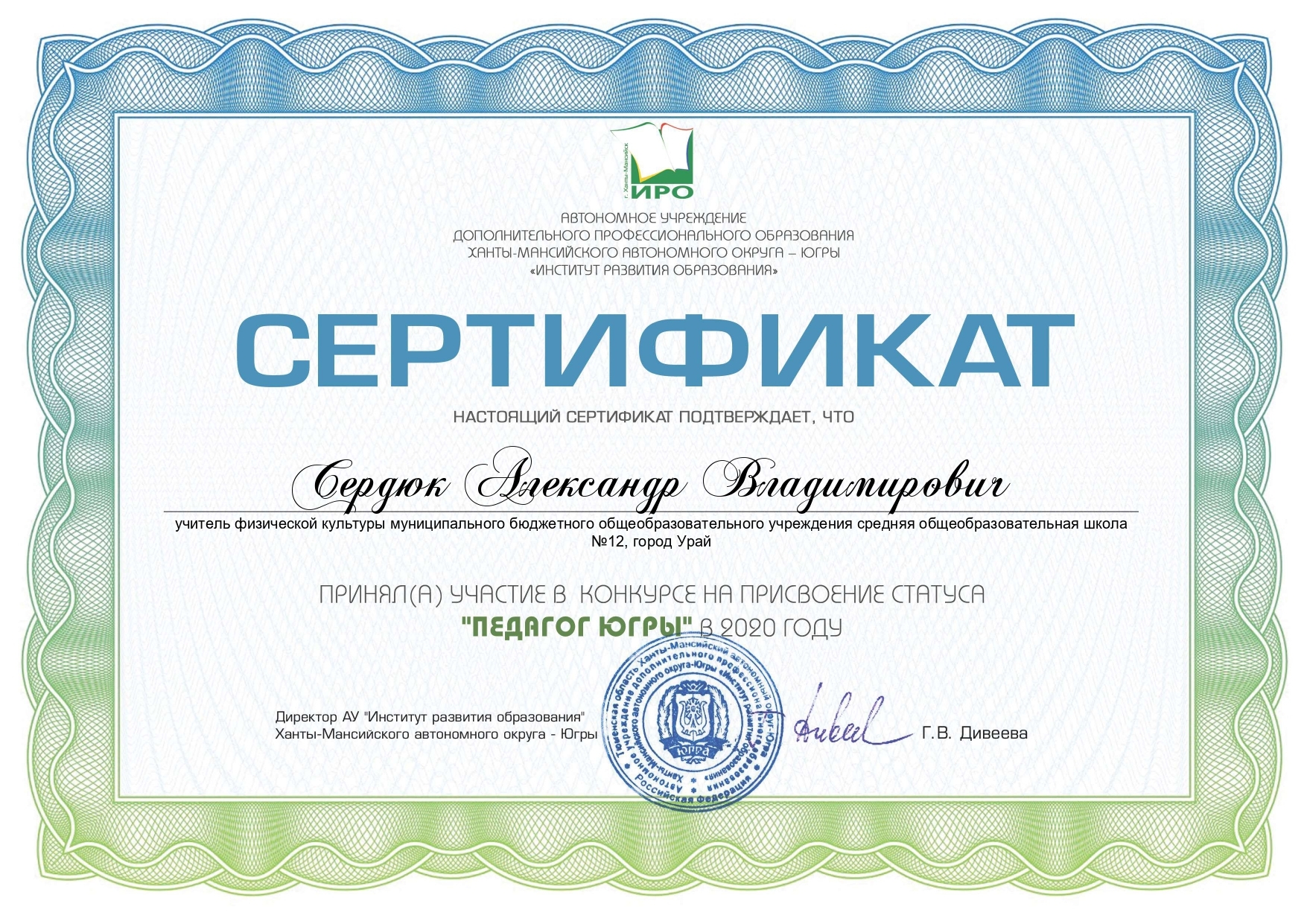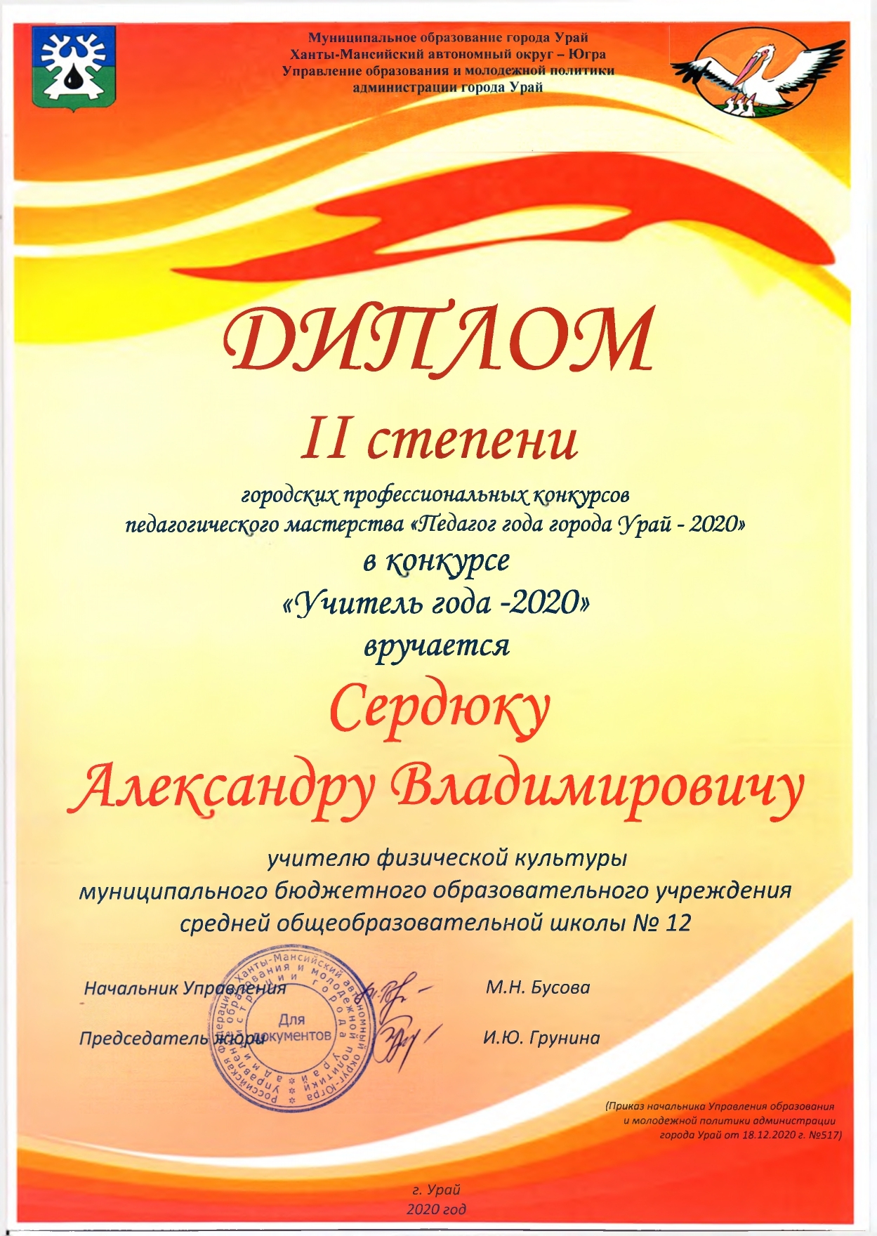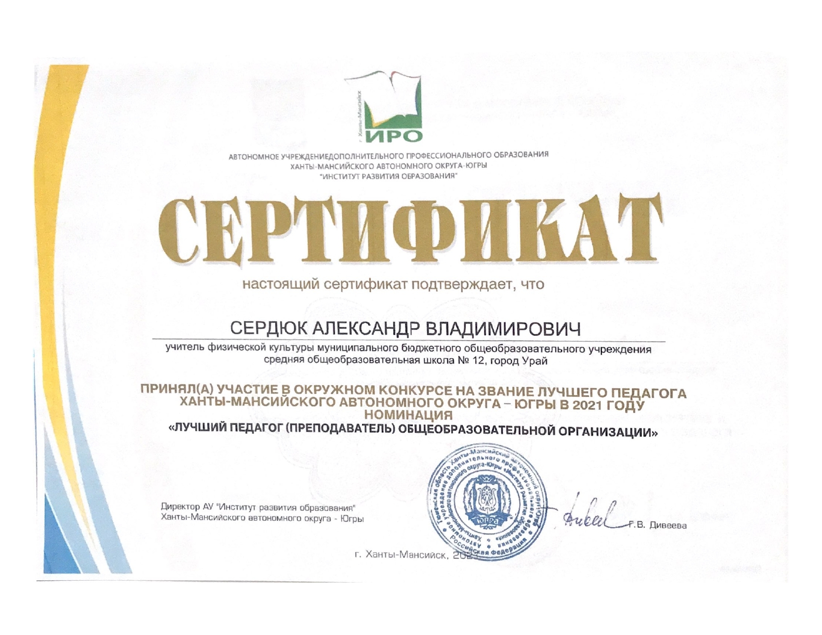 За совершенствование профессионального мастерства, оценки эффективности деятельности, по обновлению содержанию и технологии дополнительного образования физкультурно-спортивной направленности, методику и технологию обучения и воспитания обучающихся, достижения воспитанников, укрепление здоровья подрастающего поколения - Победитель регионального этапа Всероссийского конкурса профессионального мастерства среди педагогических работников, осуществляющих обучение детей по дополнительным общеобразовательным программам в области физической культуры и спорта в Ханты-Мансийском автономно округе – Югре в номинации «Педагог – формула успеха».