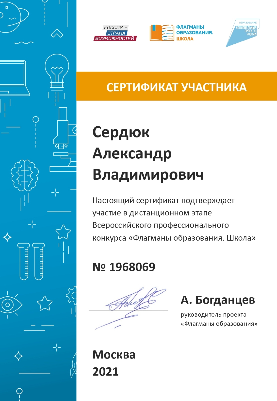 Отмечен Благодарственным письмом Департамента образования и молодежной политики Ханты-Мансийского автономного округа – Югры за высокое качество подготовки конкурсных работ, творческую инициативу и эффективность результатов в окружном конкурсе на звание лучшего педагога в 2021 году.