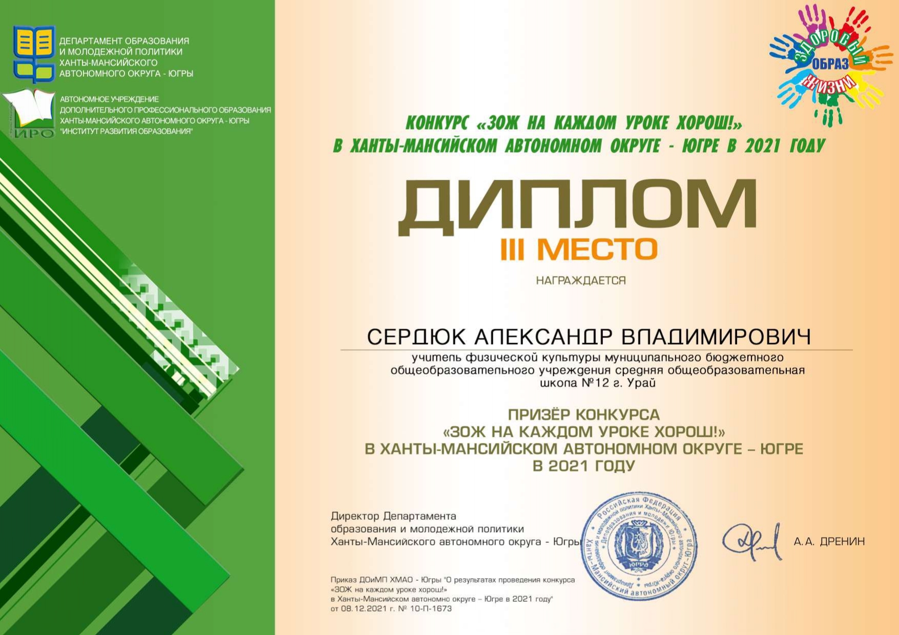 Конкурс Департамента образования и молодежной политики Ханты-Мансийского автономного округа – Югры Диплом (3 место) – «ЗОЖ на каждом уроке хорош!» в Ханты-Мансийском автономном округе – Югре в 2021 году. Тема работы: «Знакомство с комплексом «ГТО» обучающихся I-II возрастной ступени (1-3 класс)»;