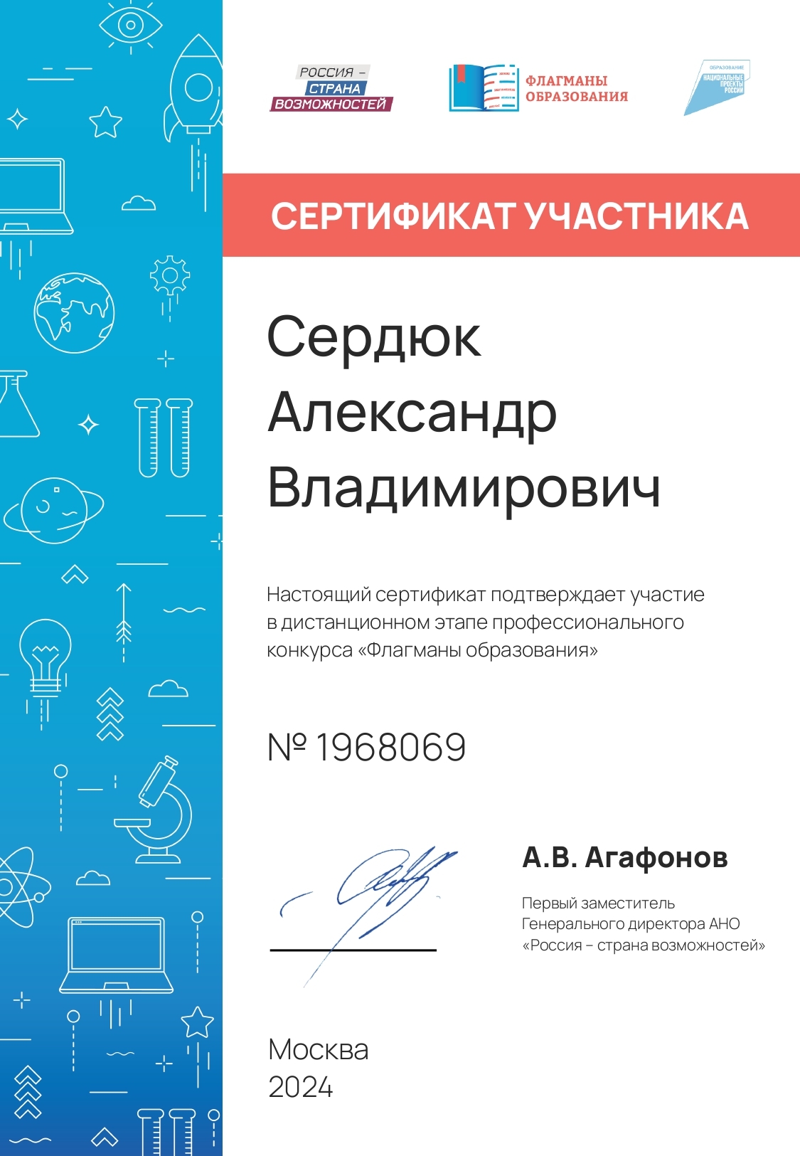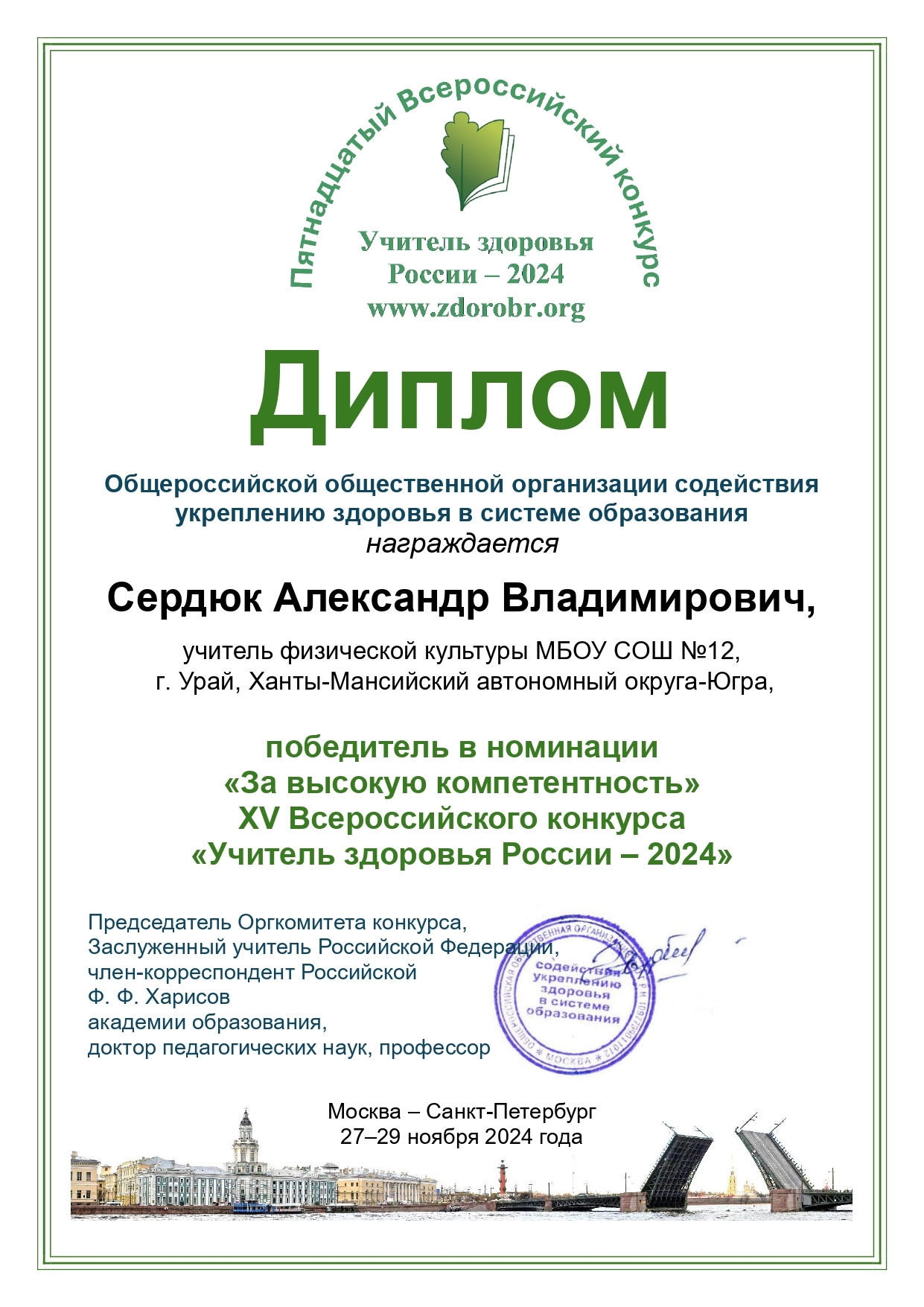 Победитель в номинации «За высокую компетентность» XV Всероссийского конкурса «Учитель здоровья России – 2024» в рамках XV Всероссийского форума «Здоровьесберегающее образование: опыт, проблемы, перспективы развития»;